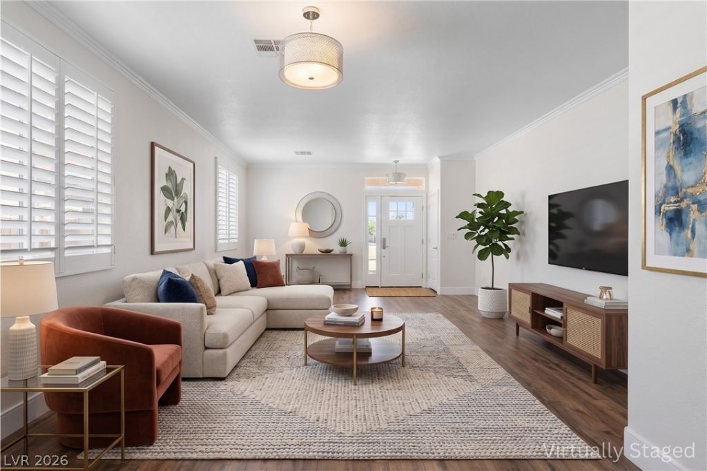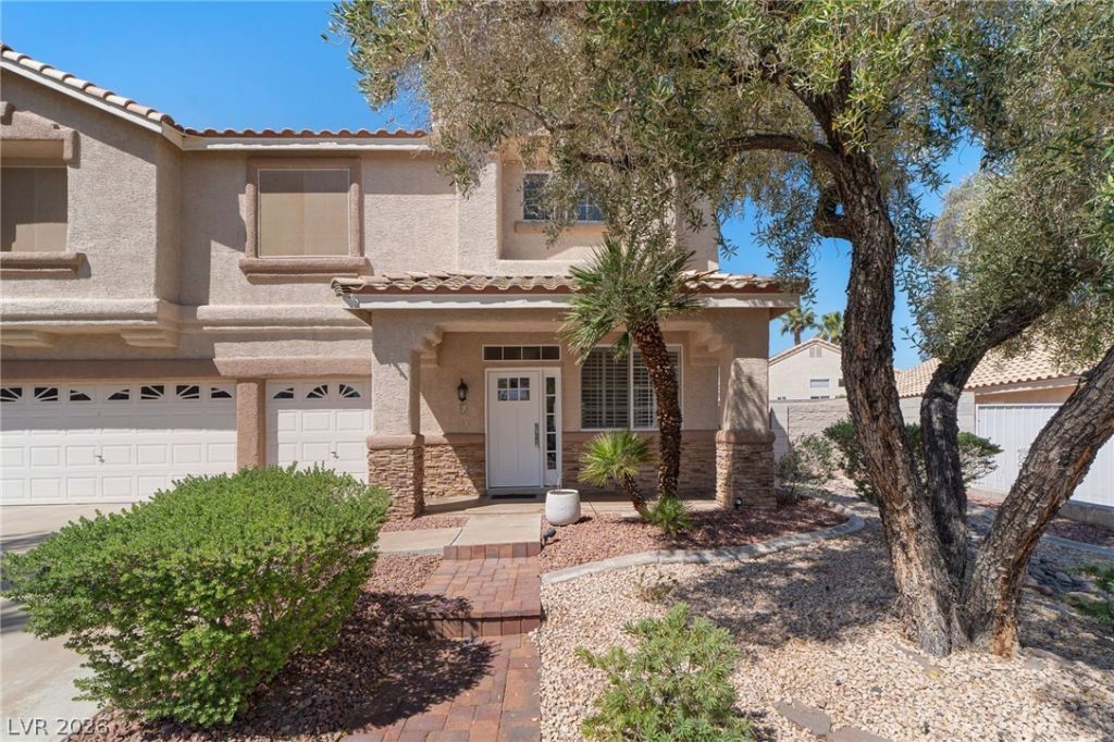 Cul-de-sac pool home in the heart of Henderson's Ventana Canyon. 5 bedrooms, 3 full baths, and 3,159 sqft of flexible living space, including a main-level bedroom and full bath ideal for guests or multigenerational living. The remodeled kitchen is the showpiece, featuring a large center island, two-tone cabinetry with pull-out shelves, quartzite countertops, full-height backsplash, stainless appliances, and a gas cooktop. Formal living room up front with plantation shutters and crown molding flows into the open kitchen and family room. Upstairs primary suite plus three additional bedrooms and a versatile loft. The resort-style backyard delivers a sparkling pool and spa, covered patio, and low-maintenance landscape built for year-round Vegas living. Minutes to The District, Galleria, 215, Henderson Hospital, and top-rated schools.